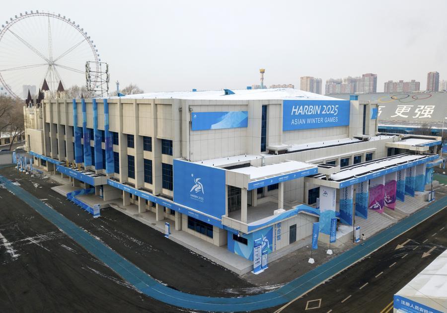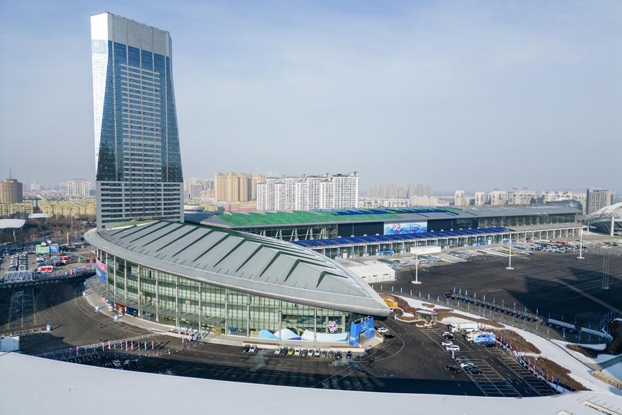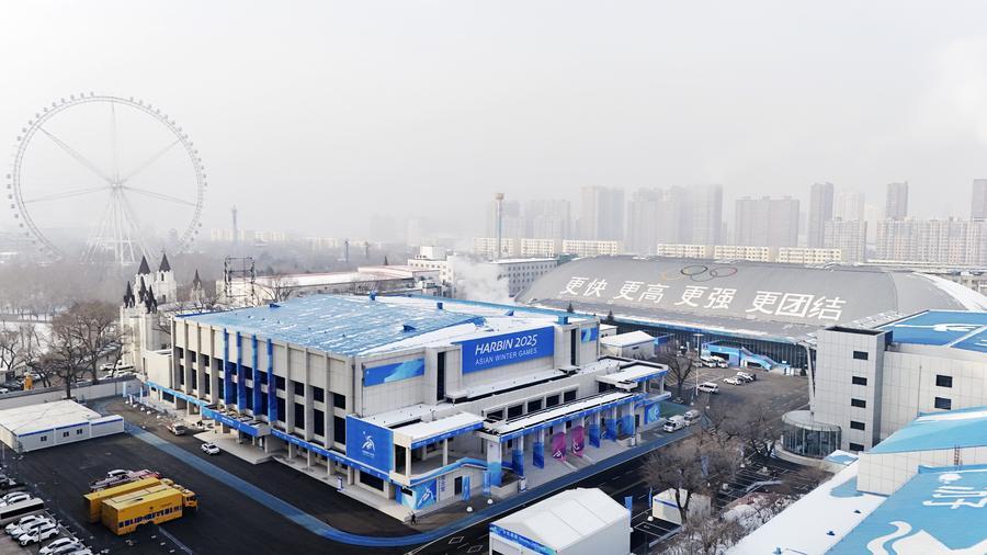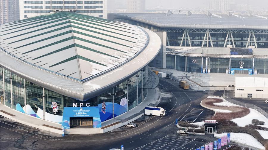 這是1月21日拍攝的哈爾濱2025年第九屆亞冬會主新聞中心(無人機照片)。新華社記者 王松 攝