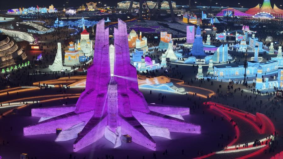 這是1月26日拍攝的第二十六屆哈爾濱冰雪大世界園區(qū)內(nèi)的第九屆亞冬會會徽冰雕,哈爾濱冰雪大世界將作為亞冬會開幕式的分會場(無人機照片)。新華社記者 王松 攝