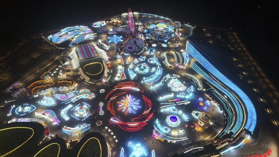 這是1月26日拍攝的第二十六屆哈爾濱冰雪大世界園區(qū),這里將作為亞冬會開幕式的分會場(無人機照片)。新華社記者 王松 攝