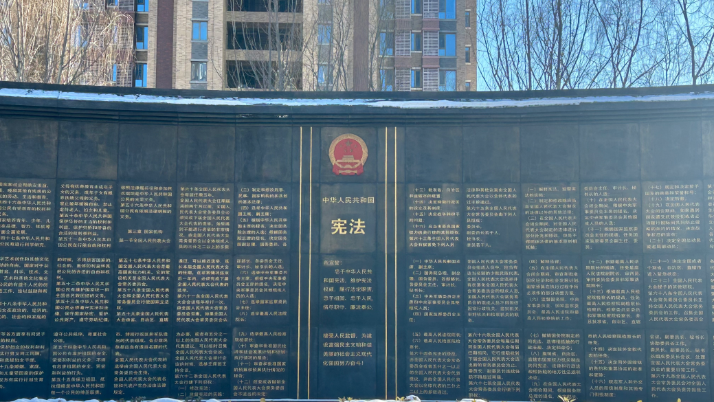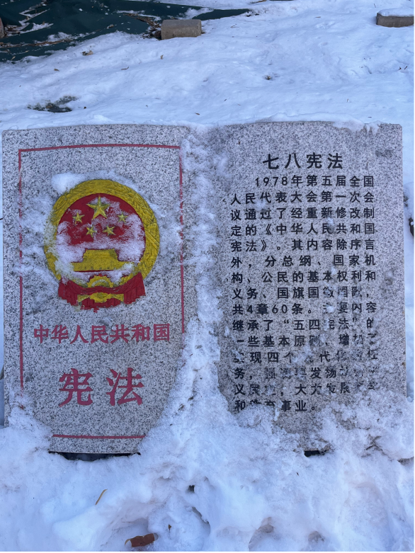 1月28日,農(nóng)歷臘月廿九,大雪過后的滄州憲法主題公園銀裝素裹,靜謐而莊嚴(yán)。記者走進公園發(fā)現(xiàn),紅燈籠、法治標(biāo)語、憲法宣傳展板交相輝映,濃濃的新春氛圍撲面而來。