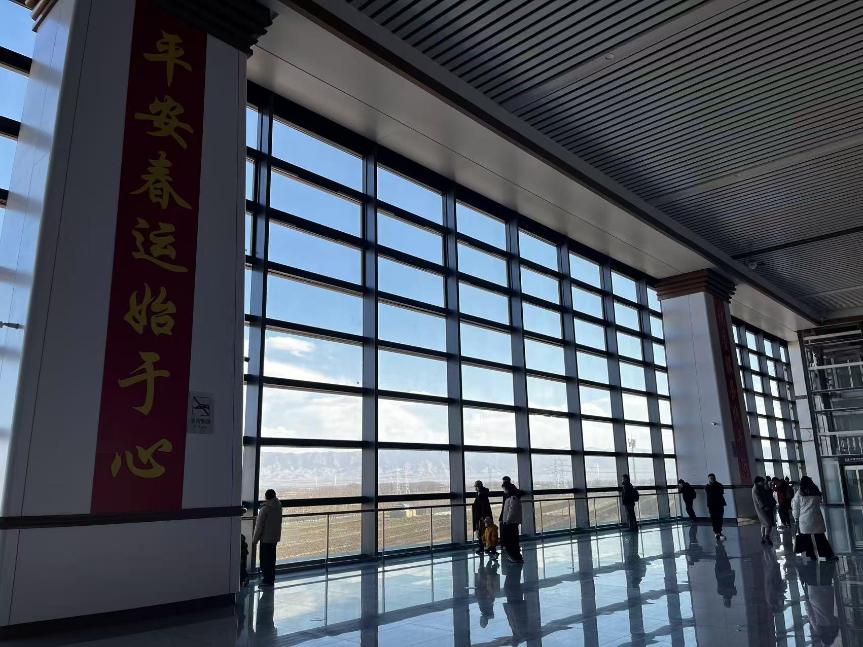 圖為乘客們在候車大廳倚窗而立,遠眺銀裝素裹的山巒和廣袤無垠的大地。