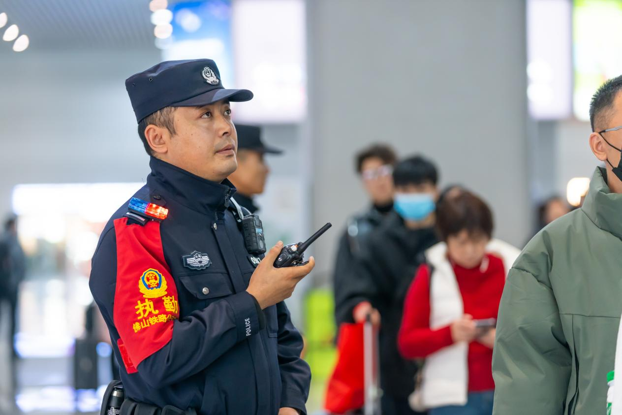 教導員鐘紹向記者介紹,面對一年一度的春運“大考”,佛山西站派出所的民警與南海區(qū)近300名志愿者攜手合作,采用全天候值班的方式,盡全力維護站內秩序及安全。同時,“民警+志愿者”的聯(lián)動機制在春運期間發(fā)揮著十分重要的作用,共同守護好旅客的回家之路。