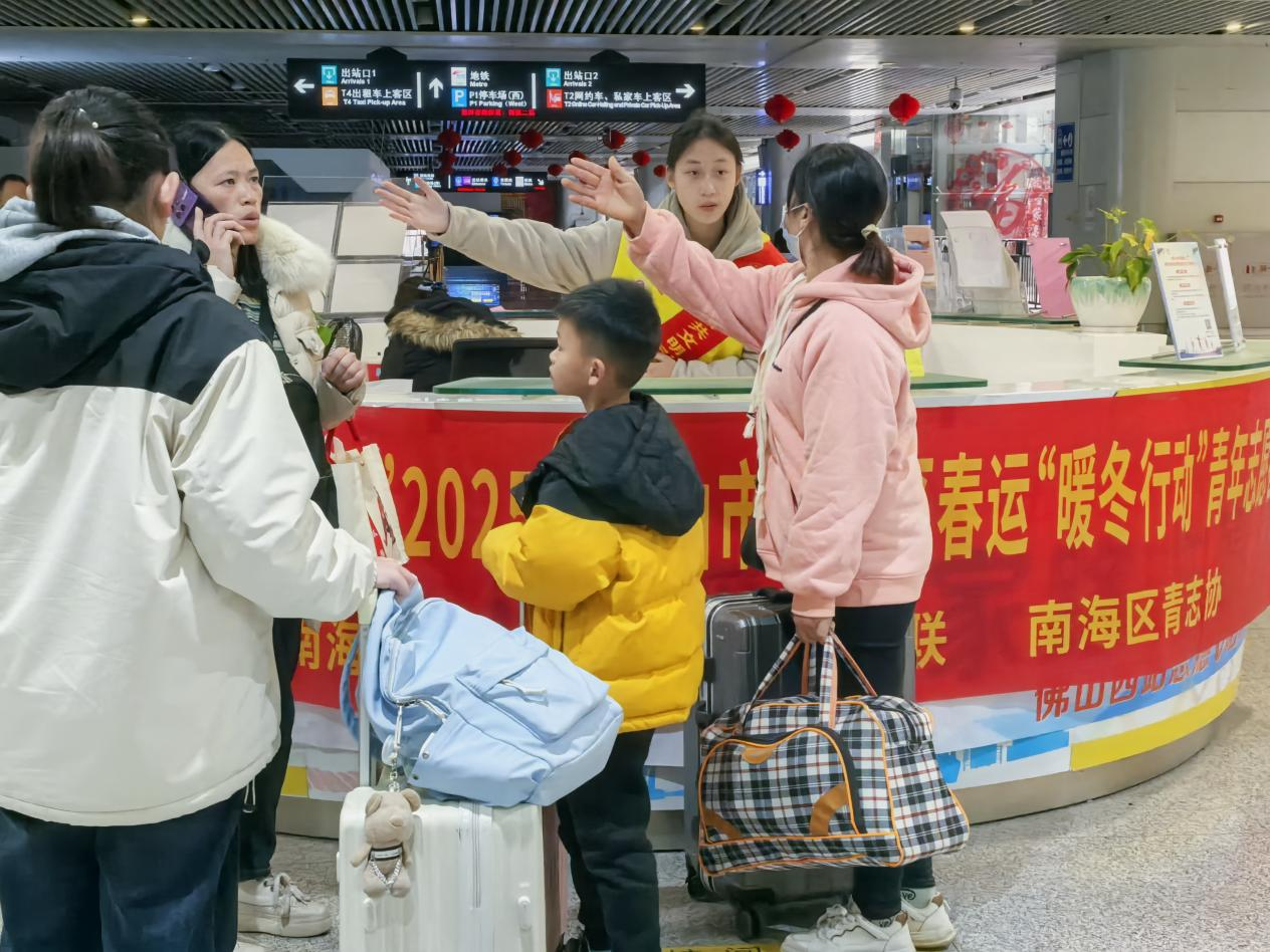 圖為南海區(qū)志愿者為過路旅客指路。通訊員 鄒轢瓊 攝