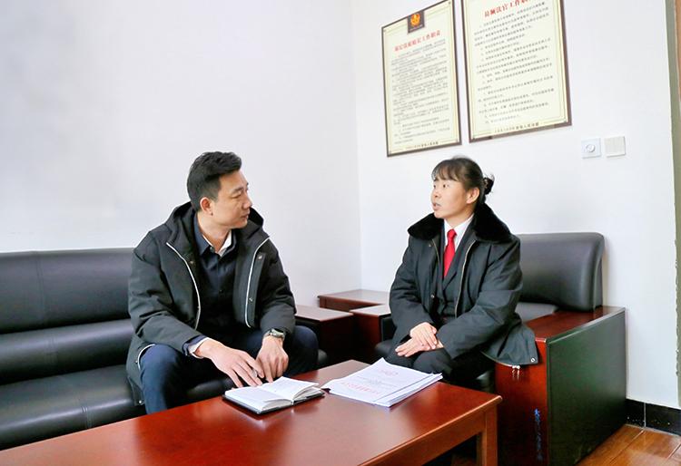 圖為記者向茹少男(右)了解大荔縣人民法院多元解紛機(jī)制。 本報通訊員 王瑞格 攝
