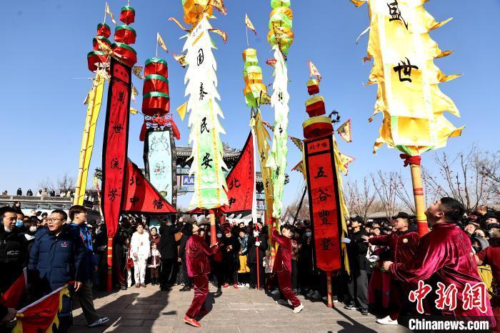 圖為2月9日,霸州市勝芳古鎮(zhèn)花會(huì)活動(dòng)現(xiàn)場中幡會(huì)表演。賈珺 攝