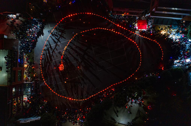 當晚6點開始,伴隨著熱鬧的鑼鼓聲,陣陣響亮的炮仗聲,一條由100多節(jié)板凳聚合而成的長龍流光溢彩,格外顯眼。