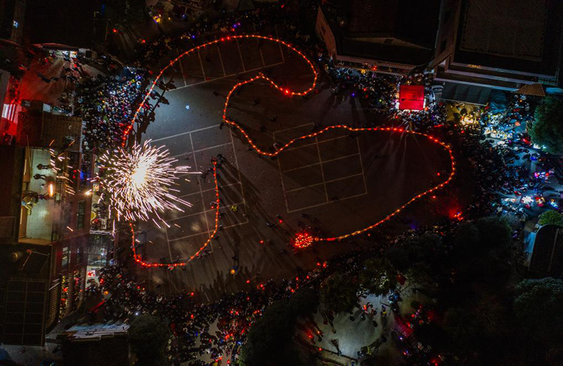 2月10日,赤松鎮(zhèn)虎巖村村民抬著板凳龍,開始進行晚上的巡游(無人機照片)。新華社記者徐昱 攝
