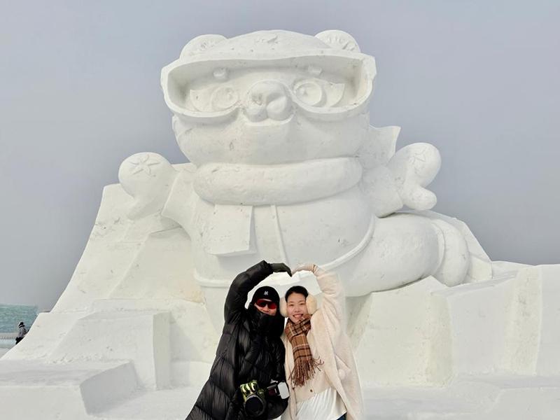 在哈爾濱冰雪大世界,來自臺灣的“95后”游客蔡湘庭正與亞冬會吉祥物“濱濱”“妮妮”的冰雕、雪雕合影?!皝磉@里正好趕上元宵節(jié),紅彤彤的裝飾和熱情的人們,讓我覺得非常友好?!彼f。