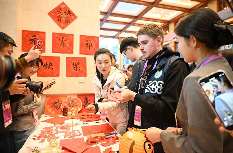 2月12日,一名哈薩克斯坦記者在活動現(xiàn)場體驗剪紙。當(dāng)日是農(nóng)歷正月十五元宵佳節(jié)。在第九屆亞洲冬季運動會亞布力賽區(qū)山地媒體中心,工作人員舉行舞龍舞獅表演、制作花燈、剪紙等互動活動,共度佳節(jié)。新華社記者 胡虎虎 攝