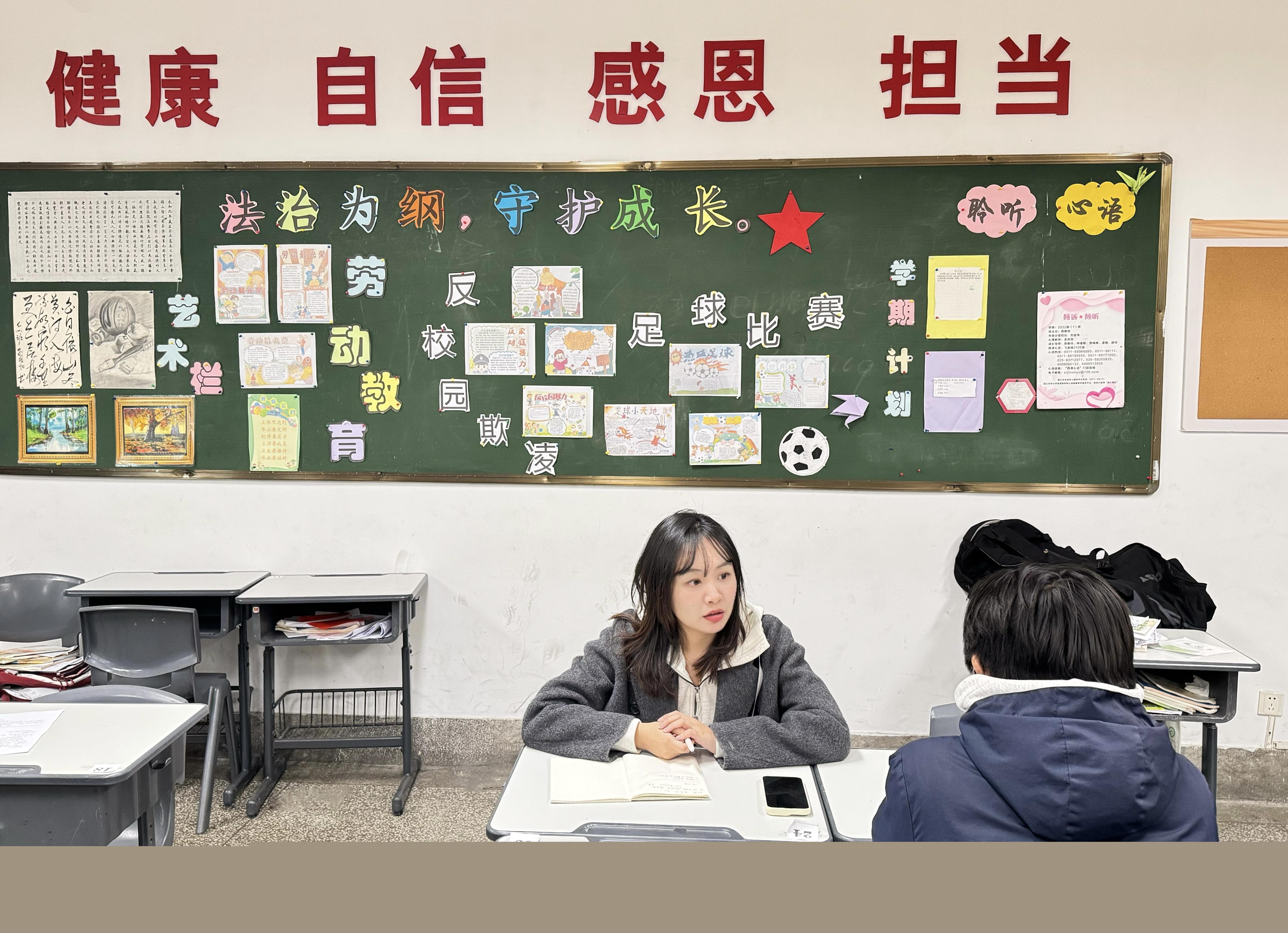 在每間教室里,都有“拒絕校園欺凌”主題黑板報,包含應對方法和孩子們親手繪制的漫畫。黑板報旁邊的公告欄,還貼滿了德育處、教務處老師以及心理教師、成長導師等校園緊急聯(lián)系人聯(lián)系方式。