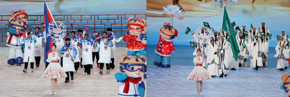 2月7日,第九屆亞洲冬季運(yùn)動會開幕式在哈爾濱舉行。圖為柬埔寨體育代表團(tuán)(左)和沙特阿拉伯體育代表團(tuán)在開幕式上入場。新華社記者 楊磊 攝