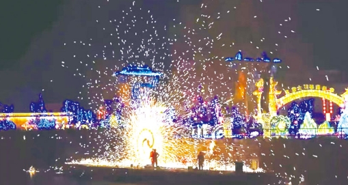 圖為曲陽(yáng)北岳廟燈會(huì)上的打鐵花表演。