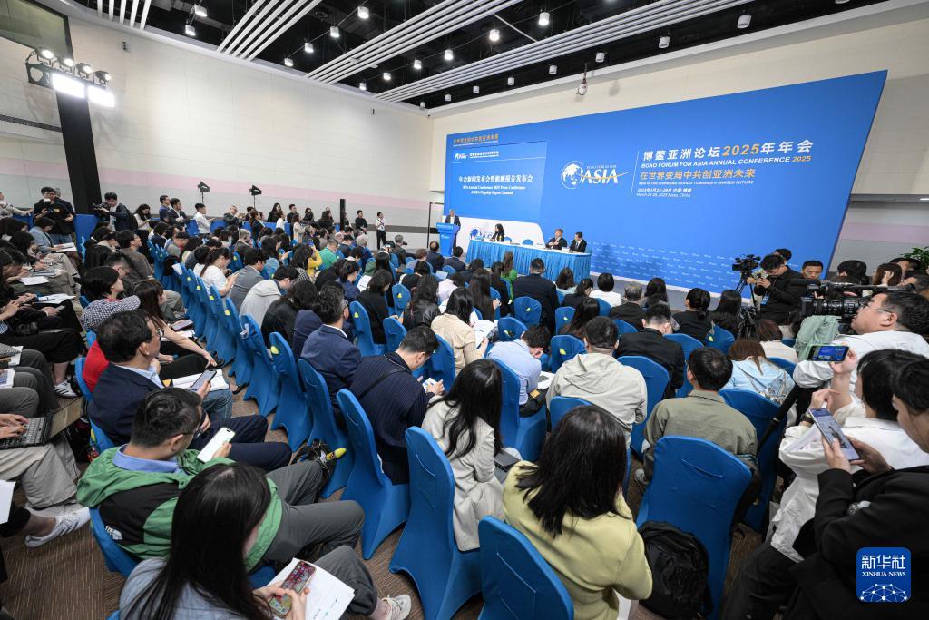 3月25日在海南博鰲拍攝的博鰲亞洲論壇2025年年會(huì)新聞發(fā)布會(huì)暨旗艦報(bào)告發(fā)布會(huì)現(xiàn)場(chǎng)。