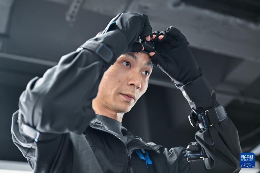 ??3月24日,工程師付龍在穿戴傳感器設(shè)備。
