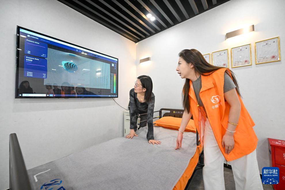 在天津小橙集團有限公司,工作人員展示一款安裝有傳感器的纖維床墊(4月18日攝)。該床墊可通過終端設(shè)備直觀查看床墊受力壓力數(shù)值,被應(yīng)用于居家養(yǎng)老等服務(wù)場景。
