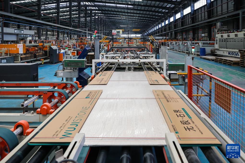 4月22日,佛山蒙娜麗莎大尺寸陶瓷巖板自動(dòng)生產(chǎn)線上的成品被自動(dòng)封裝。