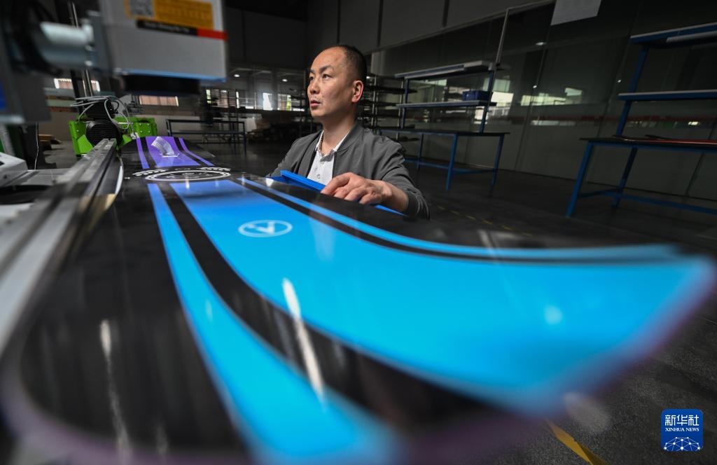 4月24日,在翔瑞馳公司生產(chǎn)車間,工人在生產(chǎn)的滑雪板上打標(biāo)。該公司生產(chǎn)的雪板、雪鞋、固定器等產(chǎn)品已經(jīng)出現(xiàn)在多個(gè)國際冰雪賽事上。