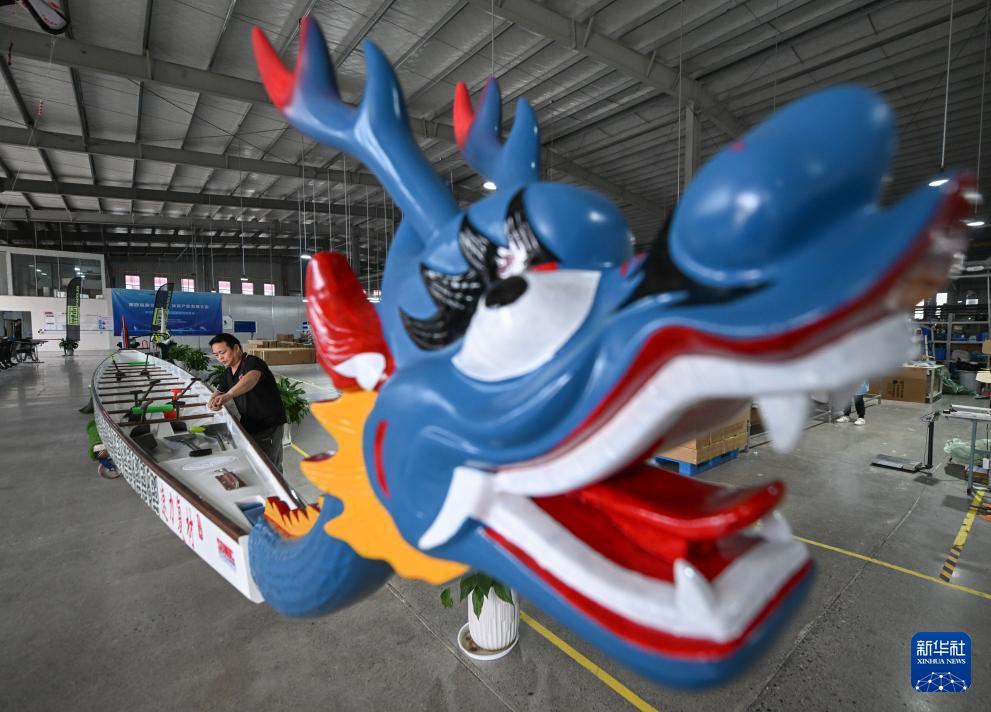 4月24日,在速力復(fù)合材料有限公司的生產(chǎn)車間內(nèi),工人在檢查一艘即將出廠的龍舟。