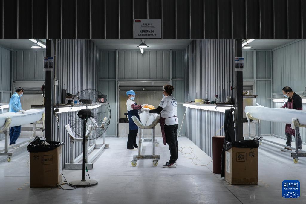 4月24日,在速力復(fù)合材料有限公司的生產(chǎn)車間內(nèi),工人在裝配海洋船。2024年,速力復(fù)材成為巴黎奧運(yùn)會新增的風(fēng)帆水翼賽事唯一指定生產(chǎn)商。