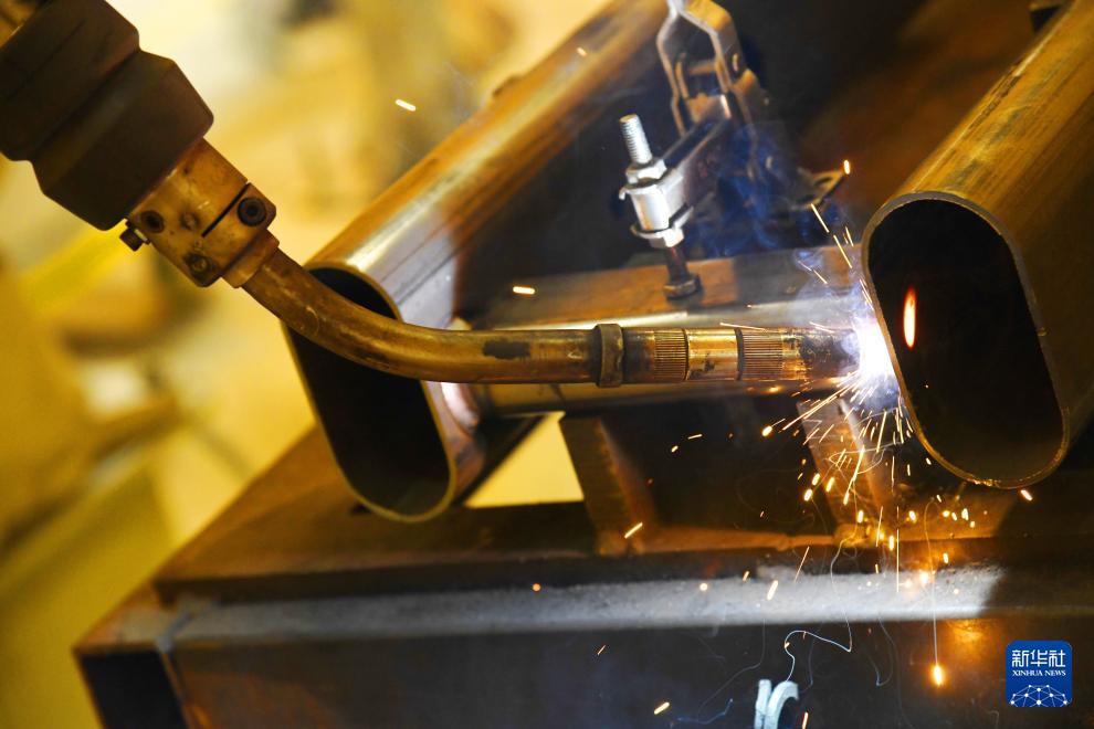 青島英派斯健康科技股份有限公司智慧工廠內(nèi)的自動(dòng)激光焊接機(jī)器人在作業(yè)(4月22日攝)。