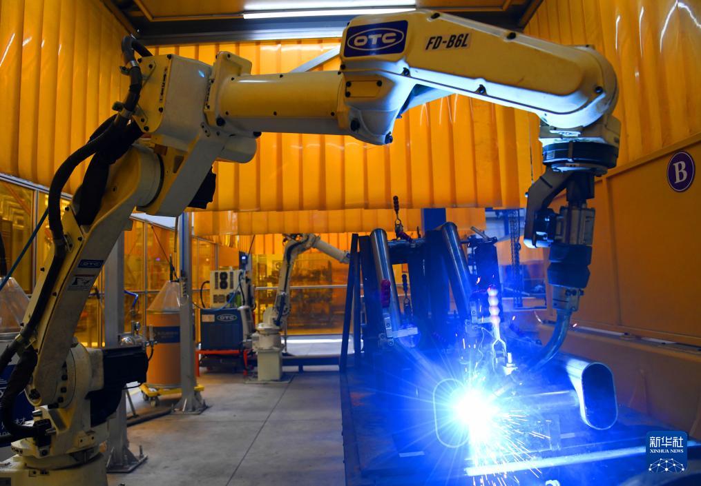 青島英派斯健康科技股份有限公司智慧工廠內的自動激光焊接機器人在作業(yè)(4月22日攝)。