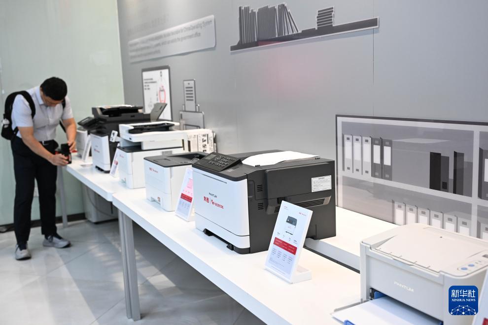 4月29日,參觀者在珠海納思達股份有限公司拍攝奔圖打印機系列產(chǎn)品。