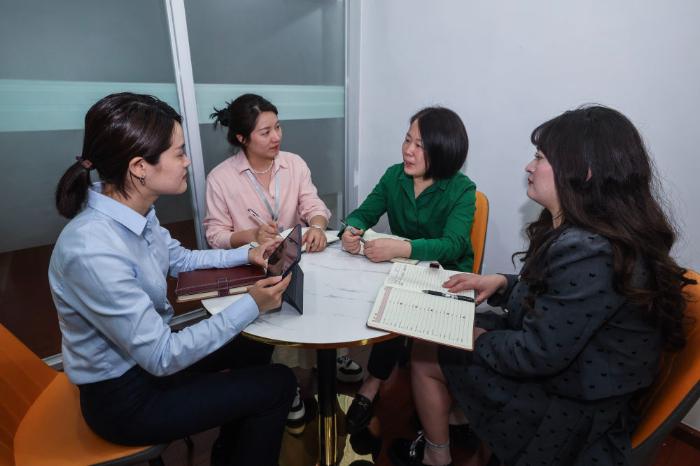 2025年4月17日,在浙江星程吉月智能科技有限公司,浙江杭州市富陽(yáng)經(jīng)濟(jì)技術(shù)開發(fā)區(qū)助企服務(wù)專員(左二)、富陽(yáng)農(nóng)商銀行工作人員(左一)上門解決企業(yè)融資需求。新華社記者 徐昱 攝