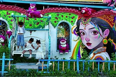 兒童在新疆伊犁特克斯縣一家手工冰激凌店前玩耍。光明日?qǐng)?bào)記者 閆匯芳攝