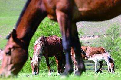 新疆伊犁新源縣那拉提“河谷草原”,正在食草的馬群。光明日?qǐng)?bào)記者 閆匯芳攝
