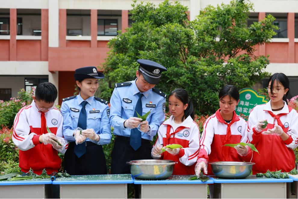 活動現(xiàn)場,民警與學生們圍坐在一起,手把手教孩子們包粽子?!棒杖~要折成漏斗狀,米不能放太多,就像法律給我們的保護,既要周全也要適度?!泵窬贿吺痉叮贿厡⒚穹ǖ渲信c未成年人相關(guān)的條款融入講解。小小的粽子裹進了防霸凌、防溺水的小貼士,孩子們在體驗傳統(tǒng)文化的同時,潛移默化地學習了法律知識。