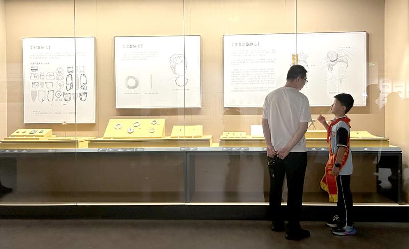 在大汶口遺址博物館,小學(xué)生志愿者為游客講解文物。