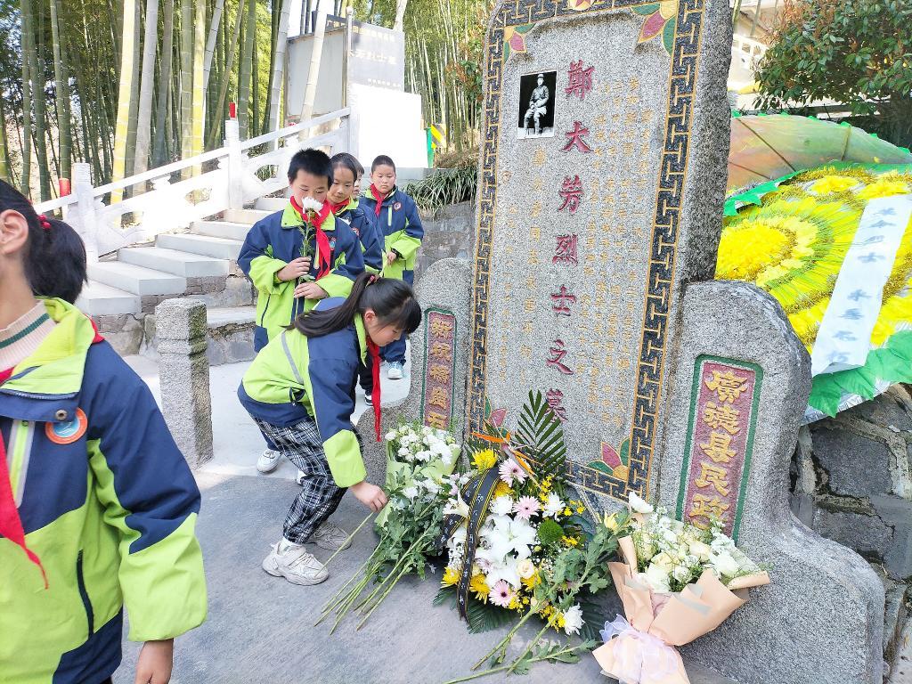 學(xué)生在鄭大芳烈士墓前敬獻(xiàn)鮮花。(受訪單位供圖)