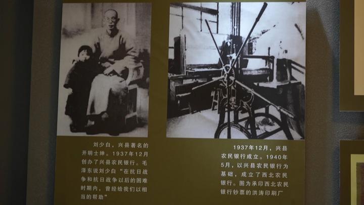 講解員張英介紹說,1937年7月7日,盧溝橋事變爆發(fā),全面抗戰(zhàn)開始,當(dāng)時(shí)八路軍120師的主力(部隊(duì))挺進(jìn)了晉西北,創(chuàng)建了晉西北的抗日根據(jù)地?!爱?dāng)時(shí)我們這個(gè)根據(jù)地的經(jīng)濟(jì)比較繁雜,在當(dāng)時(shí)不僅有偽鈔、法幣還有銀元,以及閻錫山的晉鈔,所以為了有一個(gè)我們中國共產(chǎn)黨領(lǐng)導(dǎo)的銀行,當(dāng)時(shí)就創(chuàng)建了興縣農(nóng)民銀行。1937年12月份的時(shí)候,開明士紳劉少白專門從太原返回到興縣籌備資金,籌備了6萬銀元以及700石糧食,其中蔡家崖的開明士紳牛友蘭獻(xiàn)出了總價(jià)值2.3萬銀元、物資和150石糧食,后期還有楊家坡的楊邦漢獻(xiàn)出了價(jià)值1.5萬元的房地產(chǎn)?!睆堄⒈硎尽?/p>