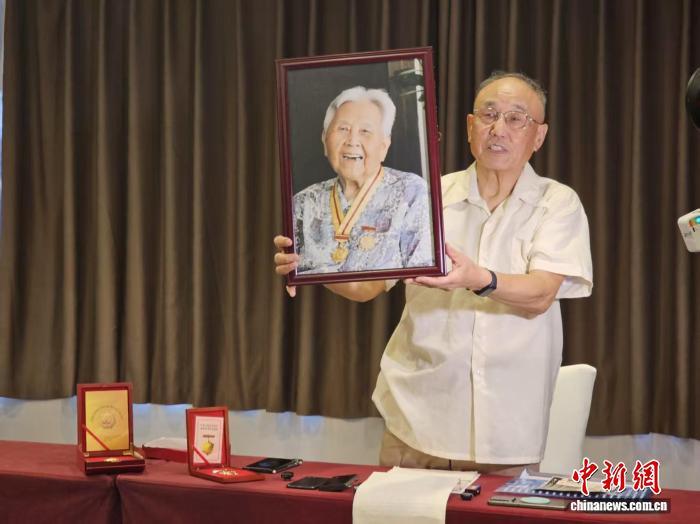 臺胞蘇菁之子張正光舉起2015年母親佩戴中國人民抗日戰(zhàn)爭勝利60周年、70周年紀(jì)念章拍下的照片。黃欣欣 攝