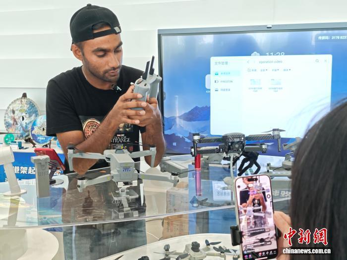 8月26日,在中國(guó)(鄂州)跨境電商產(chǎn)業(yè)園的直播中心,來(lái)自巴基斯坦的洋主播“阿布”正在TikTok直播間向北美消費(fèi)者推薦無(wú)人機(jī)。史元豐 攝