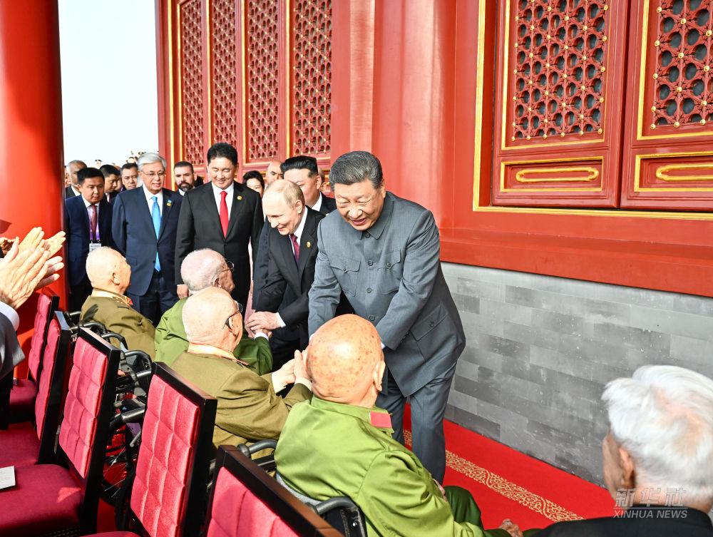 9月3日上午,習(xí)近平等登上天安門城樓。習(xí)近平同抗戰(zhàn)老戰(zhàn)士老同志代表親切握手,向他們表示崇高敬意。