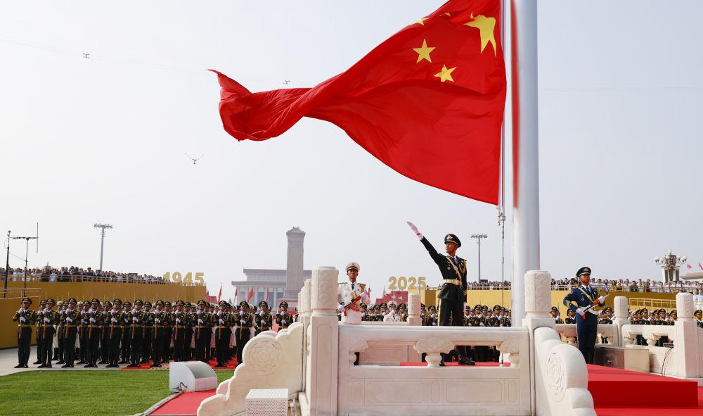 2025年9月3日,紀(jì)念中國人民抗日戰(zhàn)爭(zhēng)暨世界反法西斯戰(zhàn)爭(zhēng)勝利80周年大會(huì)在北京隆重舉行。這是天安門廣場(chǎng)舉行隆重的升國旗儀式。新華社記者 費(fèi)茂華 攝