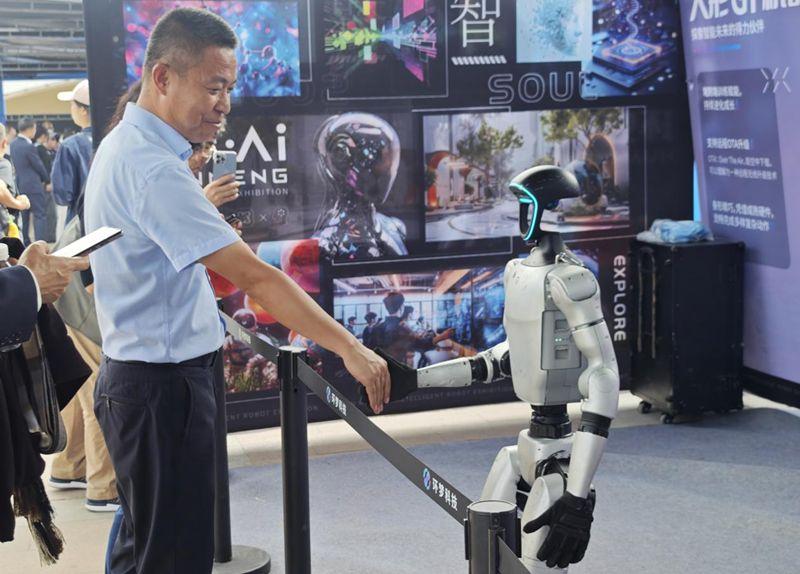 圖為參觀者與機(jī)器人互動