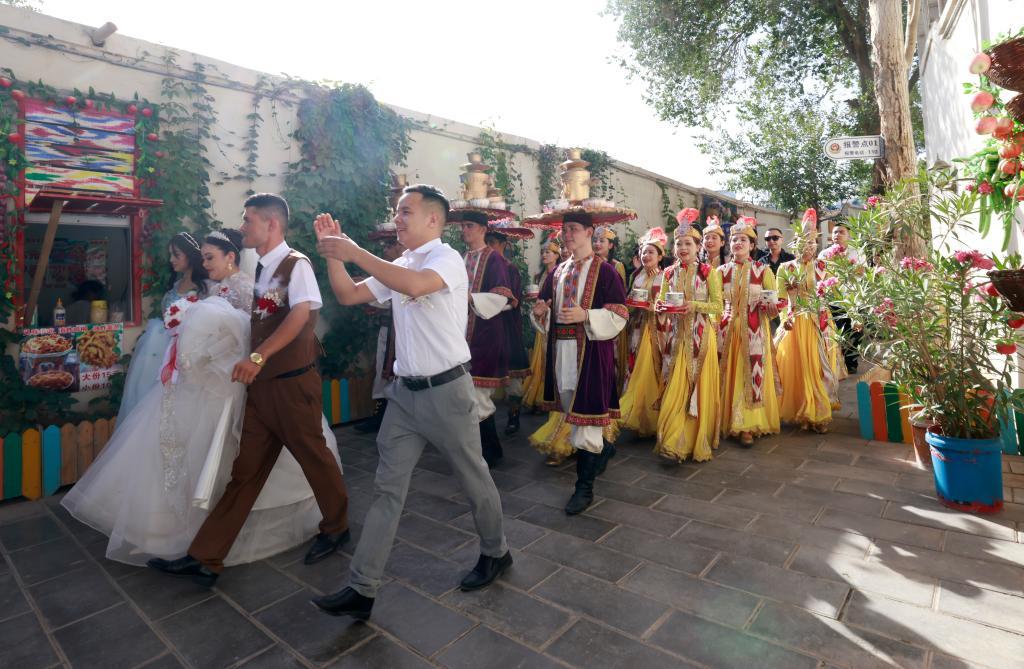 7月22日,在新疆庫車市的龜茲小巷,表演薩瑪瓦爾舞的演員參與當?shù)氐囊粓龌槎Y活動。新華社記者 王菲 攝