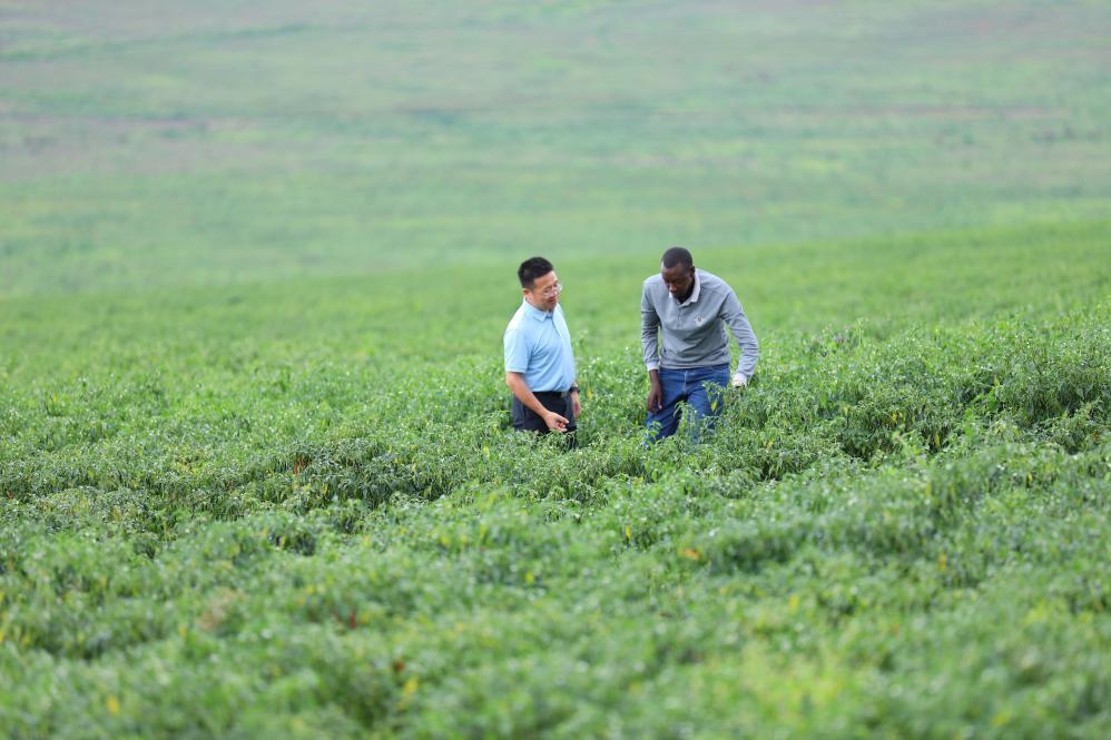 2025年5月22日,在盧旺達加紹拉農場,湘農國際非洲商務代表與當地農業(yè)技術員查看辣椒長勢。新華社記者吉莉攝