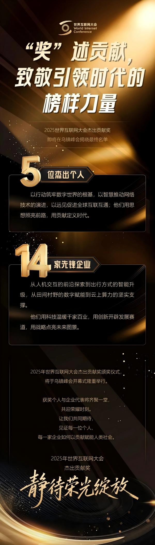 世界互聯(lián)網(wǎng)大會(huì)自2024年起設(shè)立世界互聯(lián)網(wǎng)大會(huì)杰出貢獻(xiàn)獎(jiǎng),表彰在全球互聯(lián)網(wǎng)相關(guān)領(lǐng)域作出杰出貢獻(xiàn)的個(gè)人和企業(yè)。獎(jiǎng)項(xiàng)旨在發(fā)揮榜樣模范的引領(lǐng)作用,激勵(lì)各方不斷推動(dòng)互聯(lián)網(wǎng)及相關(guān)領(lǐng)域蓬勃發(fā)展,讓更多國(guó)家和人民共享互聯(lián)網(wǎng)發(fā)展成果。