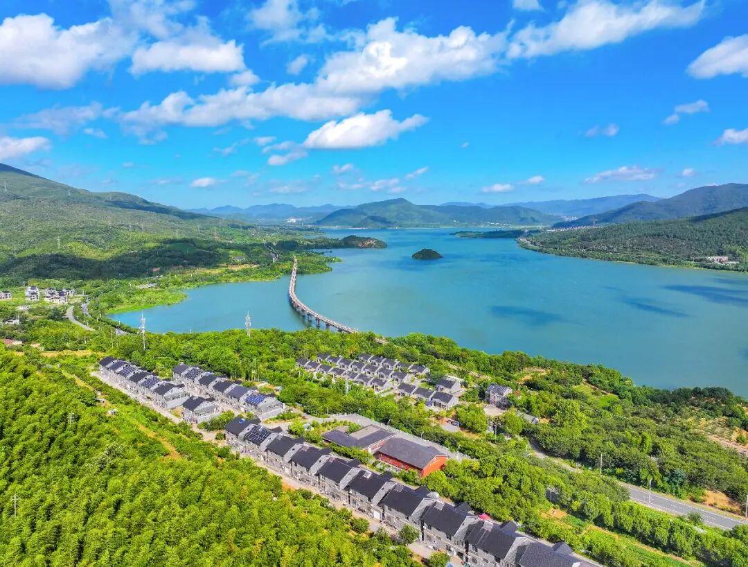 浙江省湖州市長興縣小浦鎮(zhèn)合溪村,水庫與青山、村莊、道路相映成景,構(gòu)成一幅風光旖旎、生態(tài)秀美的綠水青山壯麗畫卷。陳海偉 攝