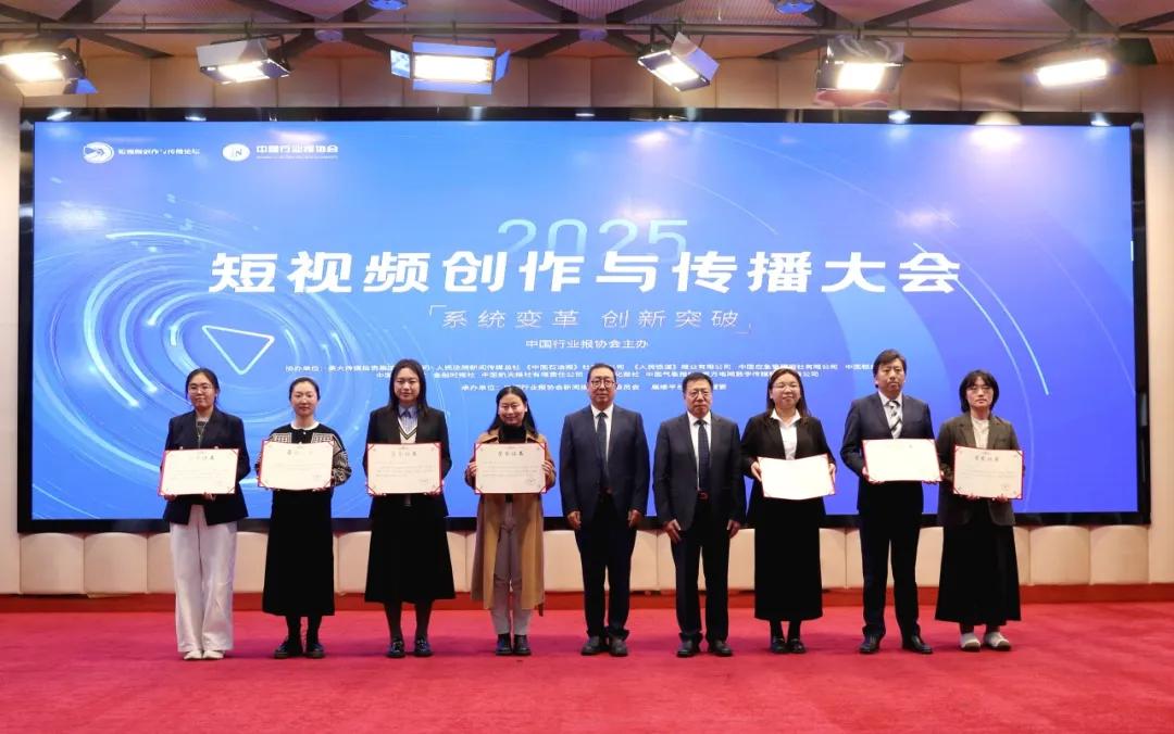 《人民鐵道》報(bào)業(yè)有限公司黨委書記、董事長(zhǎng)譚小建(右四),《中國石油報(bào)》社有限公司總經(jīng)理、黨委副書記耿玉鋒(左四)向2025行業(yè)媒體短視頻大賽二等獎(jiǎng)獲獎(jiǎng)代表頒發(fā)證書。董芳忠/攝