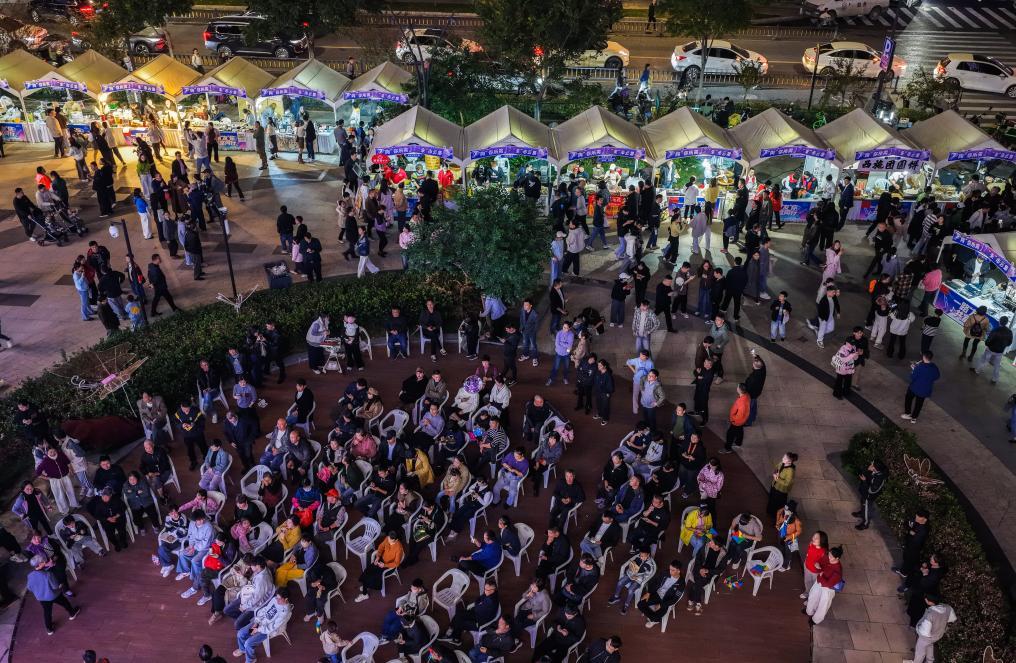 11月7日,依托當晚在西施籃球中心舉辦的系列演唱會,“陶你所需·朱市云集”社區(qū)共富市集吸引了大批市民游客(無人機照片)。新華社記者 徐昱 攝