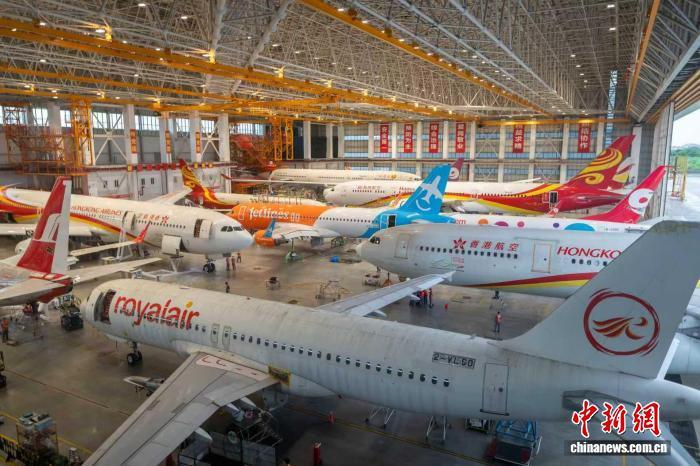 海南自貿(mào)港一站式飛機(jī)維修產(chǎn)業(yè)基地一片繁忙景象。(海航航空集團(tuán)有限公司 供圖)