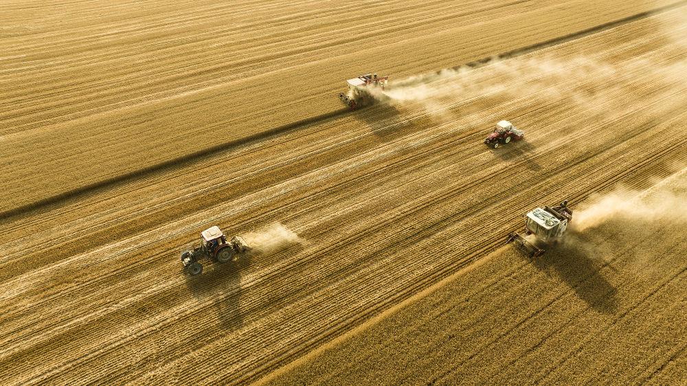 2025年6月4日,在河南省商丘市梁園區(qū)李莊鎮(zhèn)潘堂村志誠(chéng)種植農(nóng)民專業(yè)合作社,農(nóng)機(jī)手操作機(jī)械在農(nóng)田作業(yè)(無(wú)人機(jī)照片)。新華社發(fā)(李恒 攝)