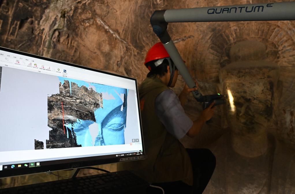 2025年4月9日,武漢大學(xué)文化遺產(chǎn)智能計(jì)算實(shí)驗(yàn)室團(tuán)隊(duì)成員在魏字洞使用關(guān)節(jié)臂掃描儀對佛像進(jìn)行數(shù)字化掃描。新華社記者 李嘉南 攝