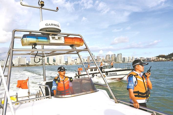 圖為海南省三亞市公安局天涯分局三亞港海岸派出所民警近日對三亞港進出港航道進行巡邏防控和疏導。 代龍超 攝