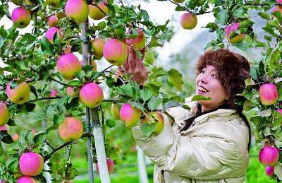 四川茂縣九頂農(nóng)牧蘋果園里,一名來自成都的游客體驗(yàn)蘋果采摘。新華社發(fā)