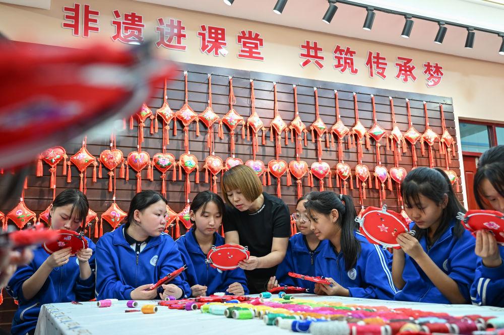 2025年9月26日,內(nèi)蒙古興安盟科右中旗巴彥呼舒第六中學(xué)美術(shù)教師、非遺傳承人吳斯琴(左四)指導(dǎo)學(xué)生刺繡。近年來,學(xué)校將當(dāng)?shù)貒壹?jí)非遺圖什業(yè)圖刺繡引入校園,開設(shè)課程,并成立興趣社團(tuán),讓學(xué)生們近距離感受非遺的魅力,弘揚(yáng)和傳承傳統(tǒng)文化。